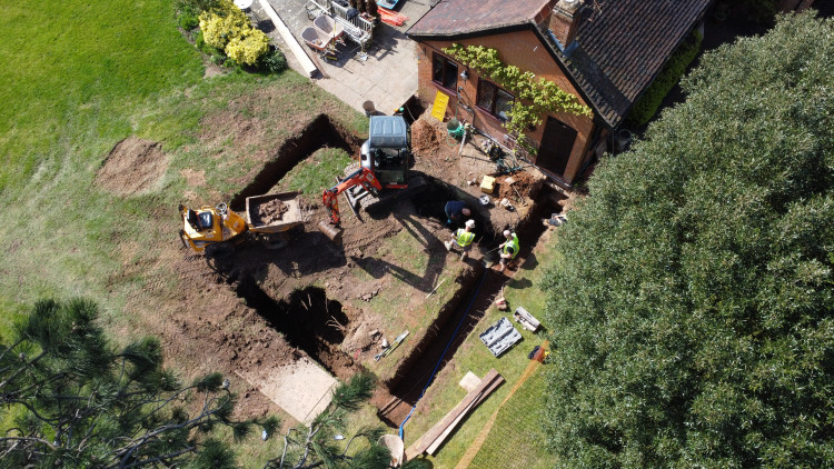 The foundations have been excavated, revealing a substantial concrete structure, thought to be holding back rainwater below ground.
